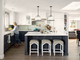 In this episode of Houzz TV Live, designer Katelyn Gilmour gives a virtual tour of her San Jose, California, home. In the kitchen, which she opened up to the living room, deep slate-navy base cabinets bring